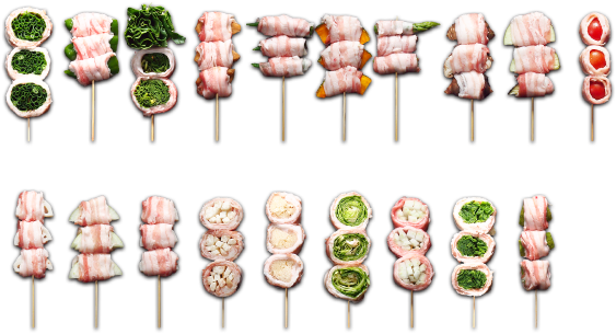 旬の野菜から定番野菜まで豚バラ肉で巻いて串に刺し